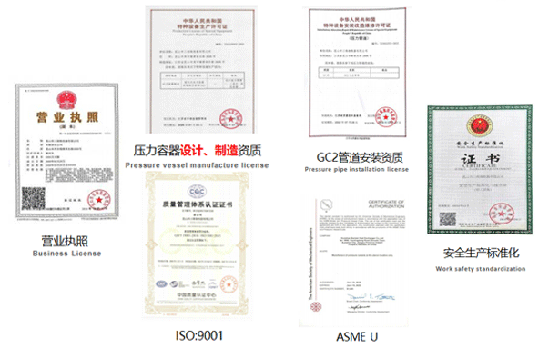 A2壓力容器制造許可證,D1/D2壓力容器設(shè)計許可證;GC2管道安裝許可證;ASME U/NB鋼印;ISO9001、ISO45001、ISO14001體系認證證書等。